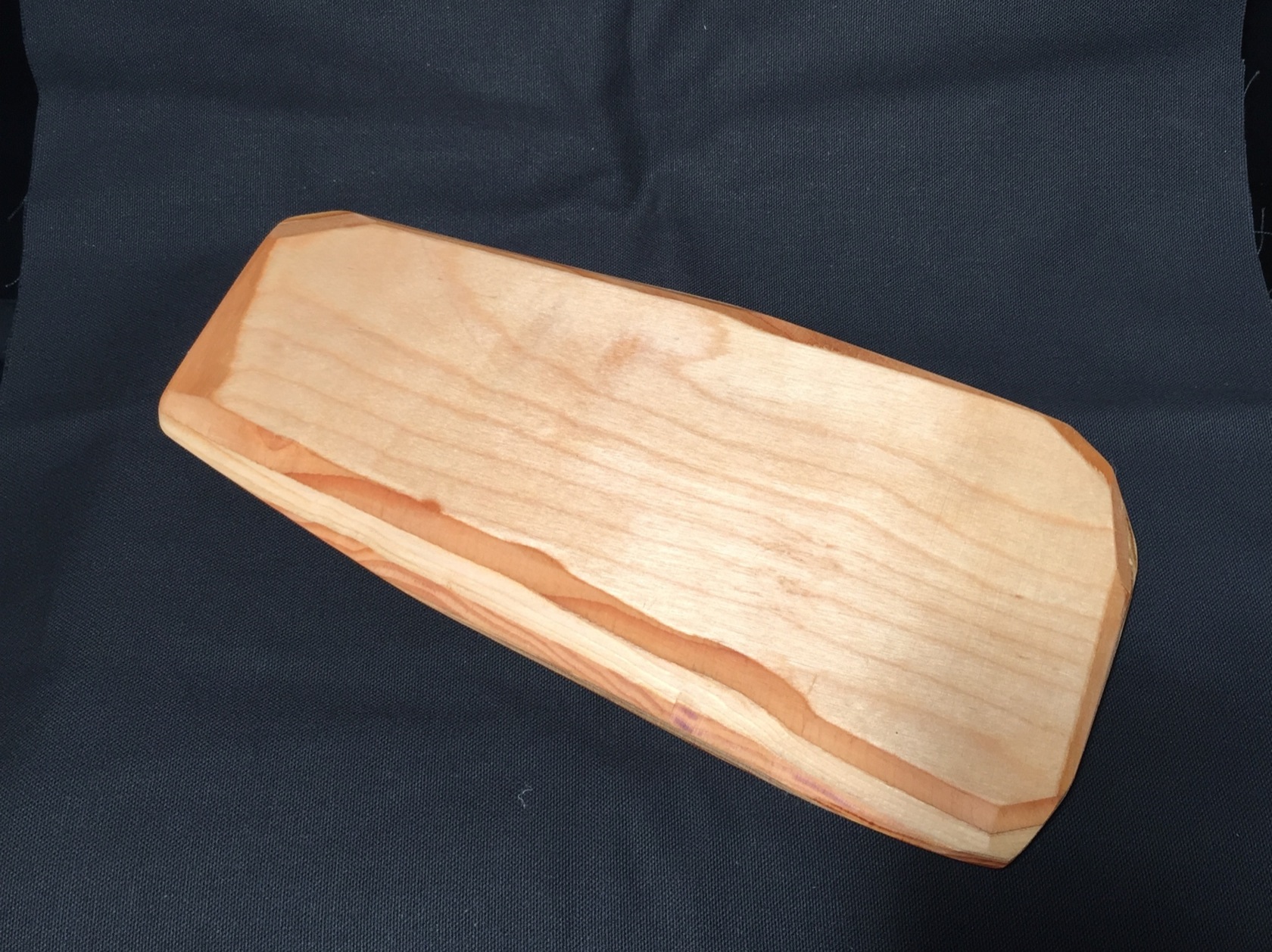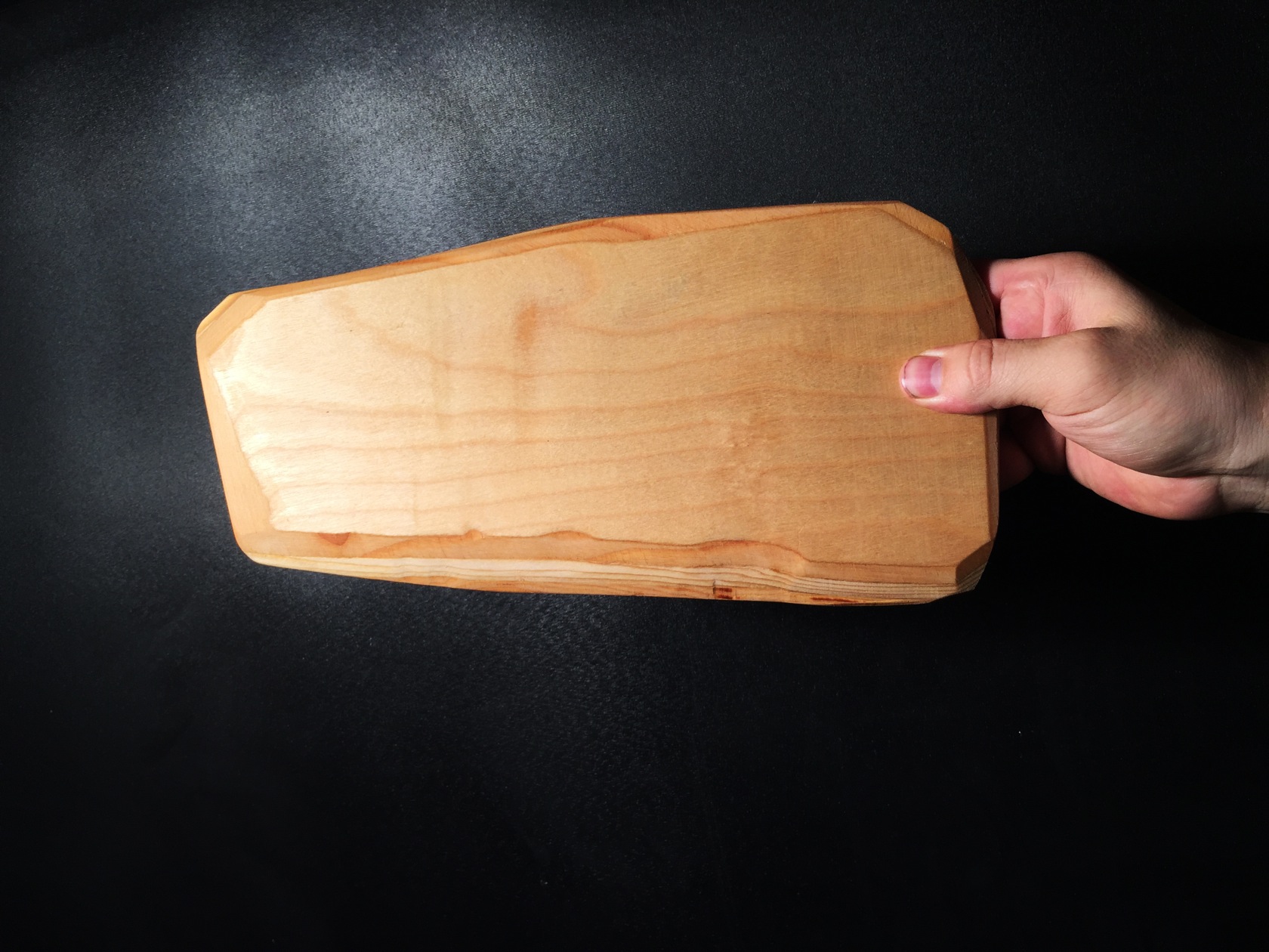 This board was created from a piece of plywood that was looking for a new life. The overall shape is geometric and angular, with a width that gradually decreases as the food on it gradually dissapears. The layers are revealed in one of the shallow angles on the top, telling the story of its stacked wooden parents. The board is large enough to present a small set of cheeses for entertaining, or to dize a few veggies.