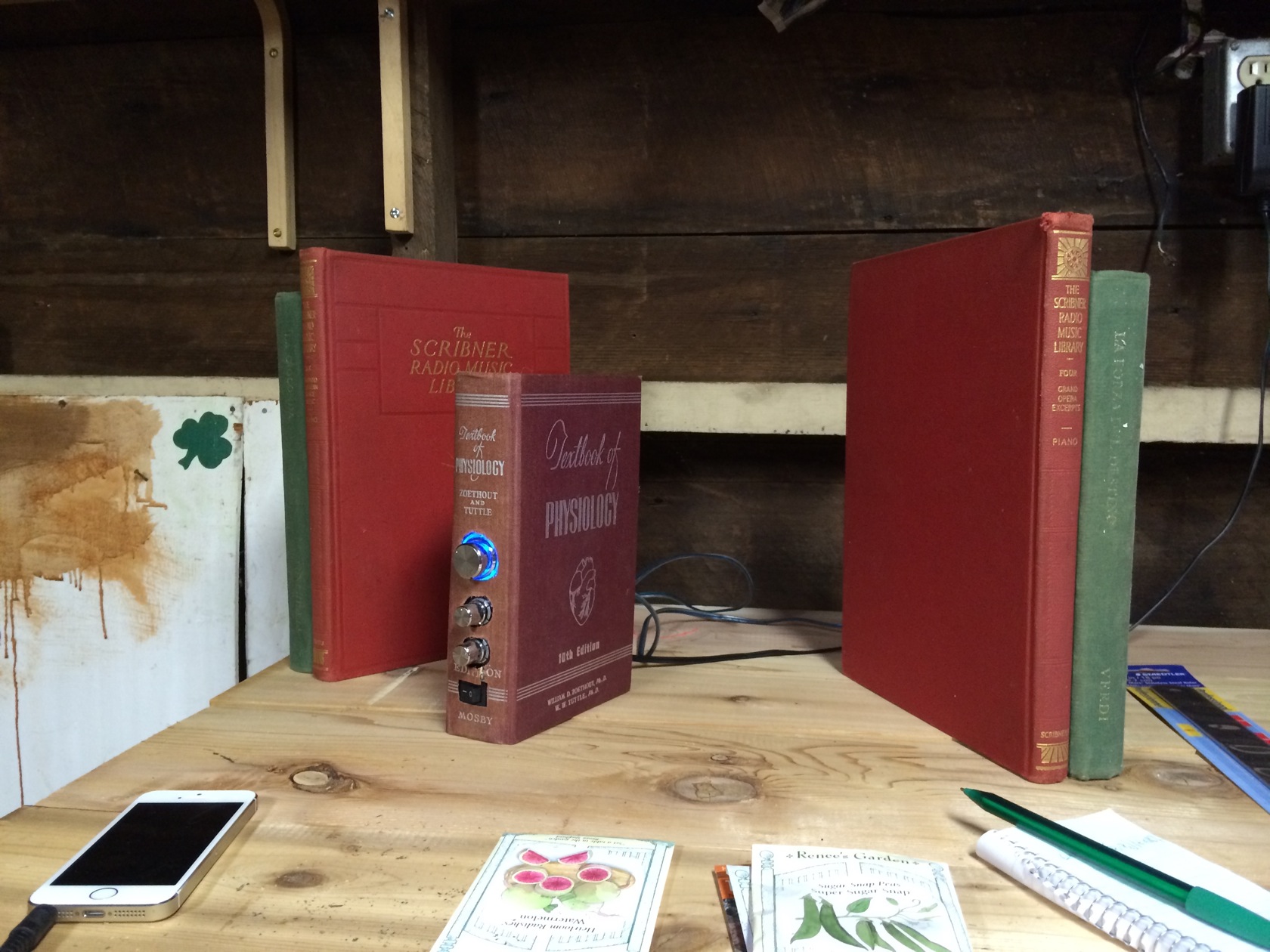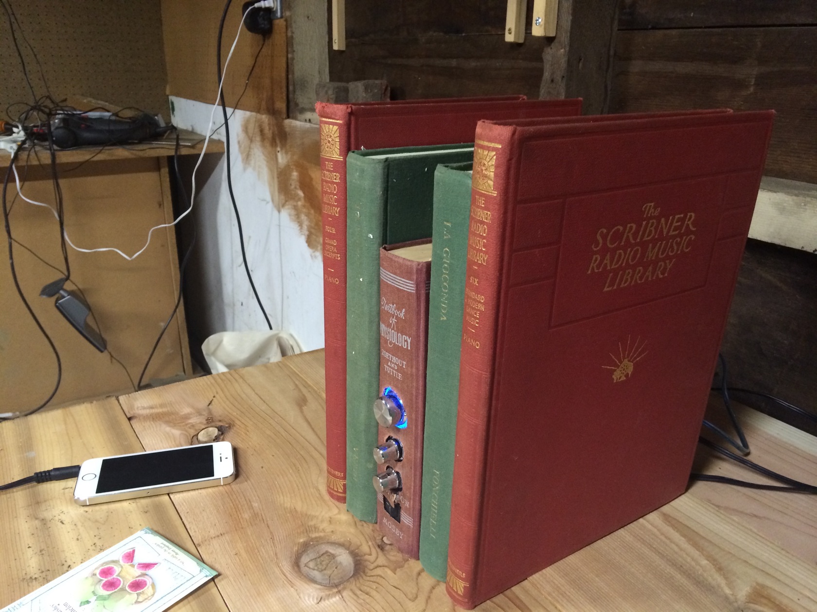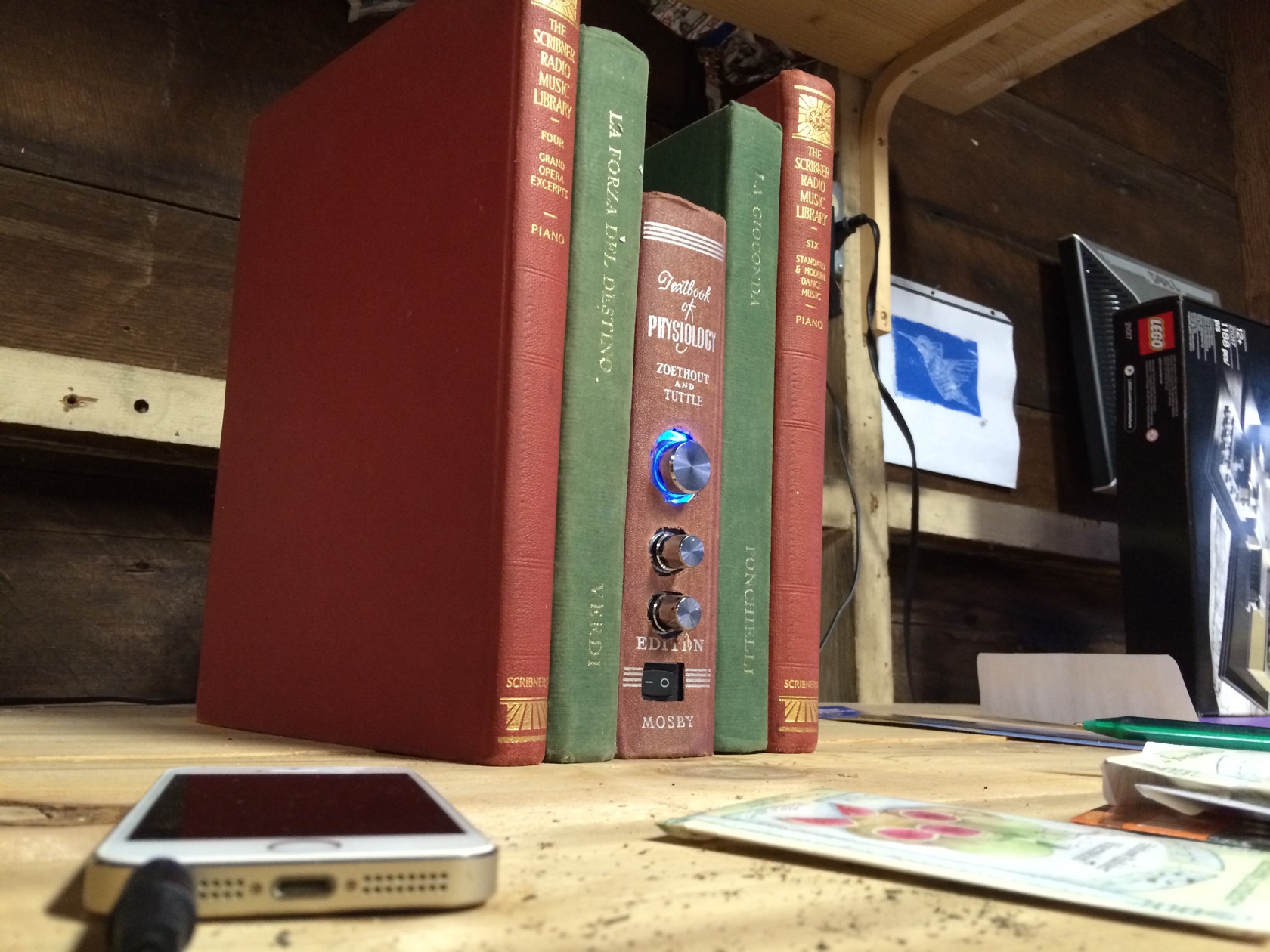 This speaker system uses the books themselves for sound creation. A typical project puts a normal speaker inside of a book, and creates air hoes for sound to transfer more efficiently. This project takes a different spin by mounting sound exciting voice coils directly the the book covers, using them to produce warm sounds.