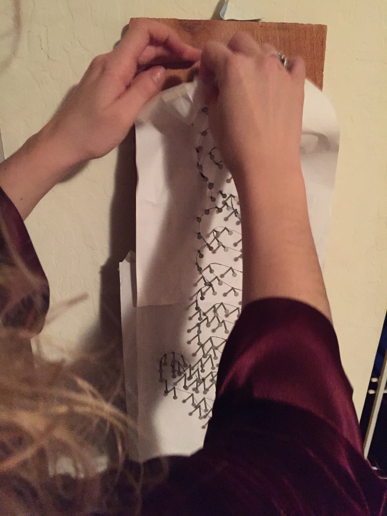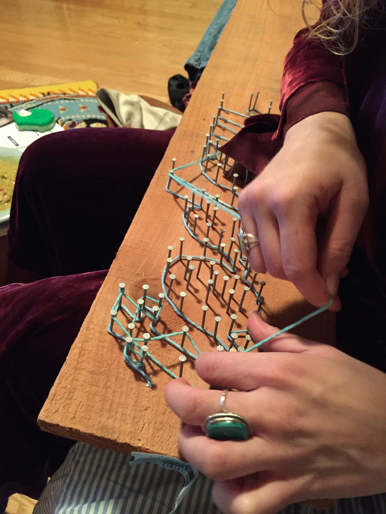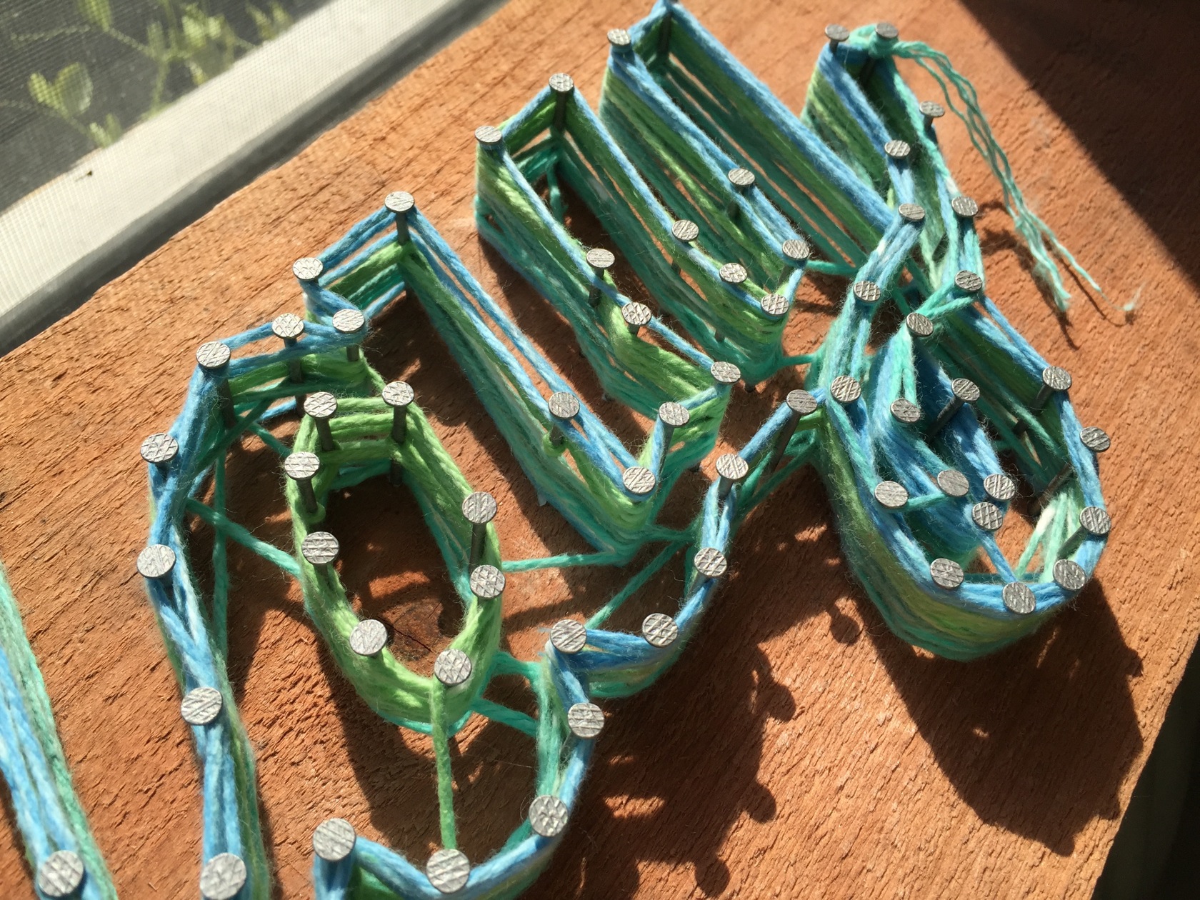 A decoration piece made of redwood plank and turquoise yarn.