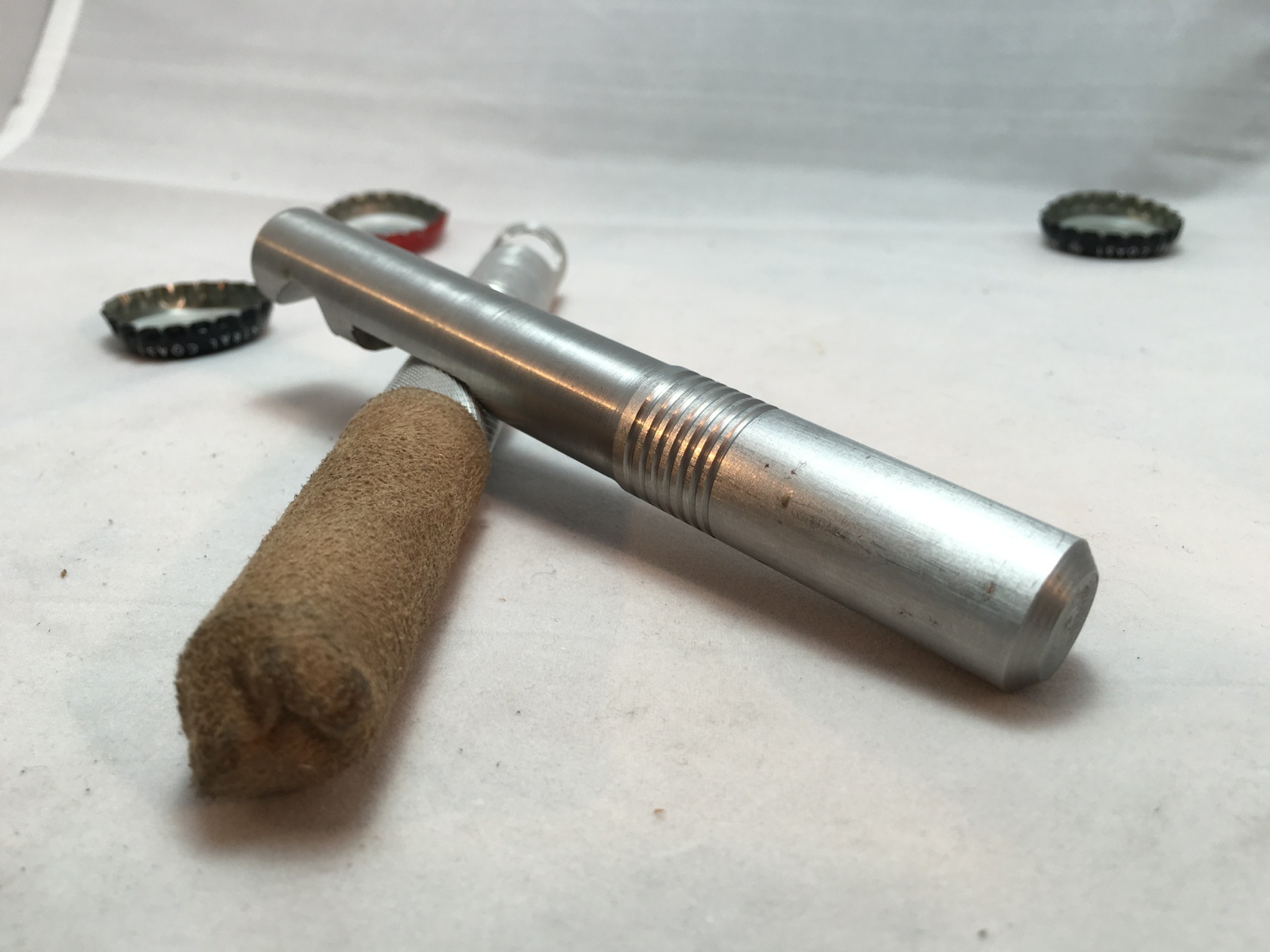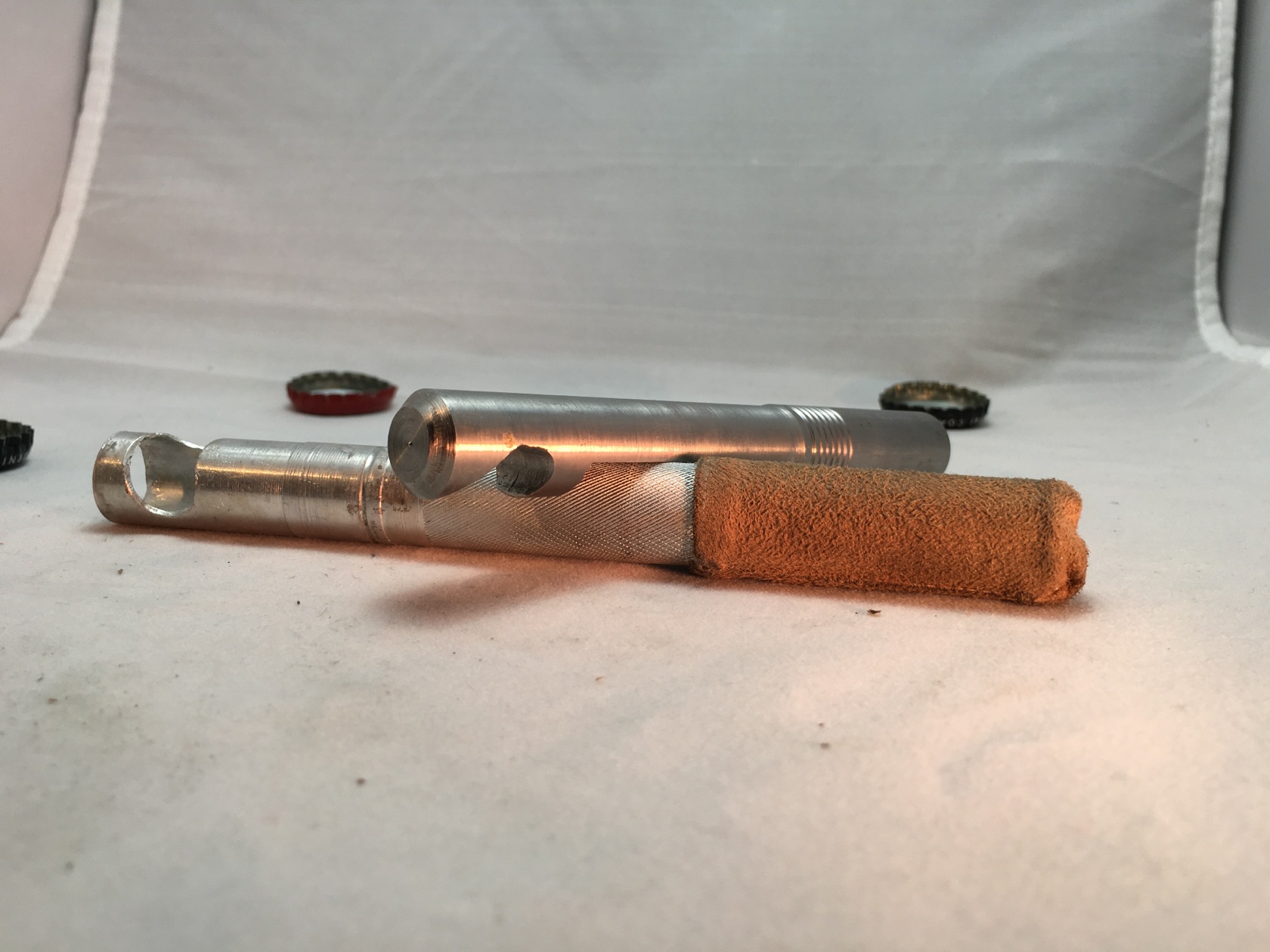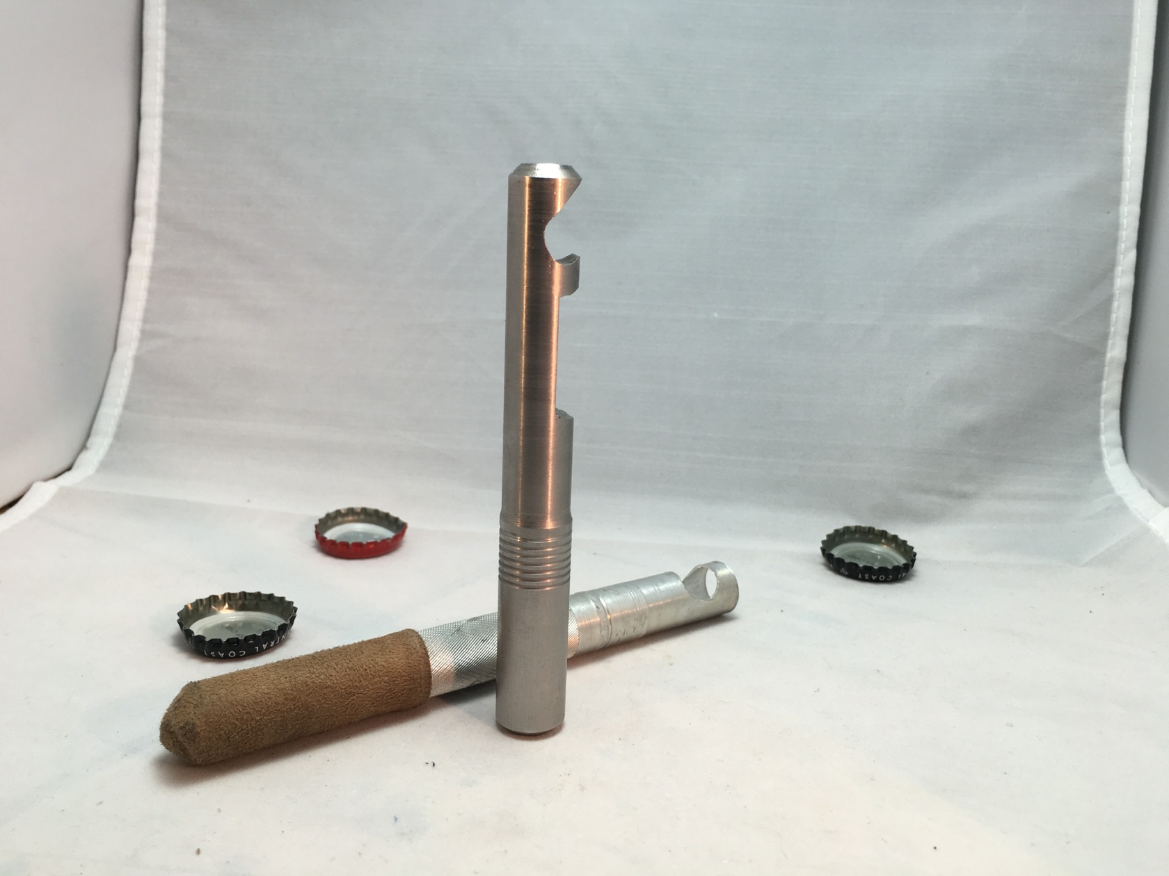 A set of bottle openers CNC machined from shaft stock. Each unit was finished on the lathe and has a custom touch to differentiate each. The Stainless version has a custom suede grip that can slide on and off of the handle. The Aluminum unit has chevron knurling up the base of it, and is very lightweight.