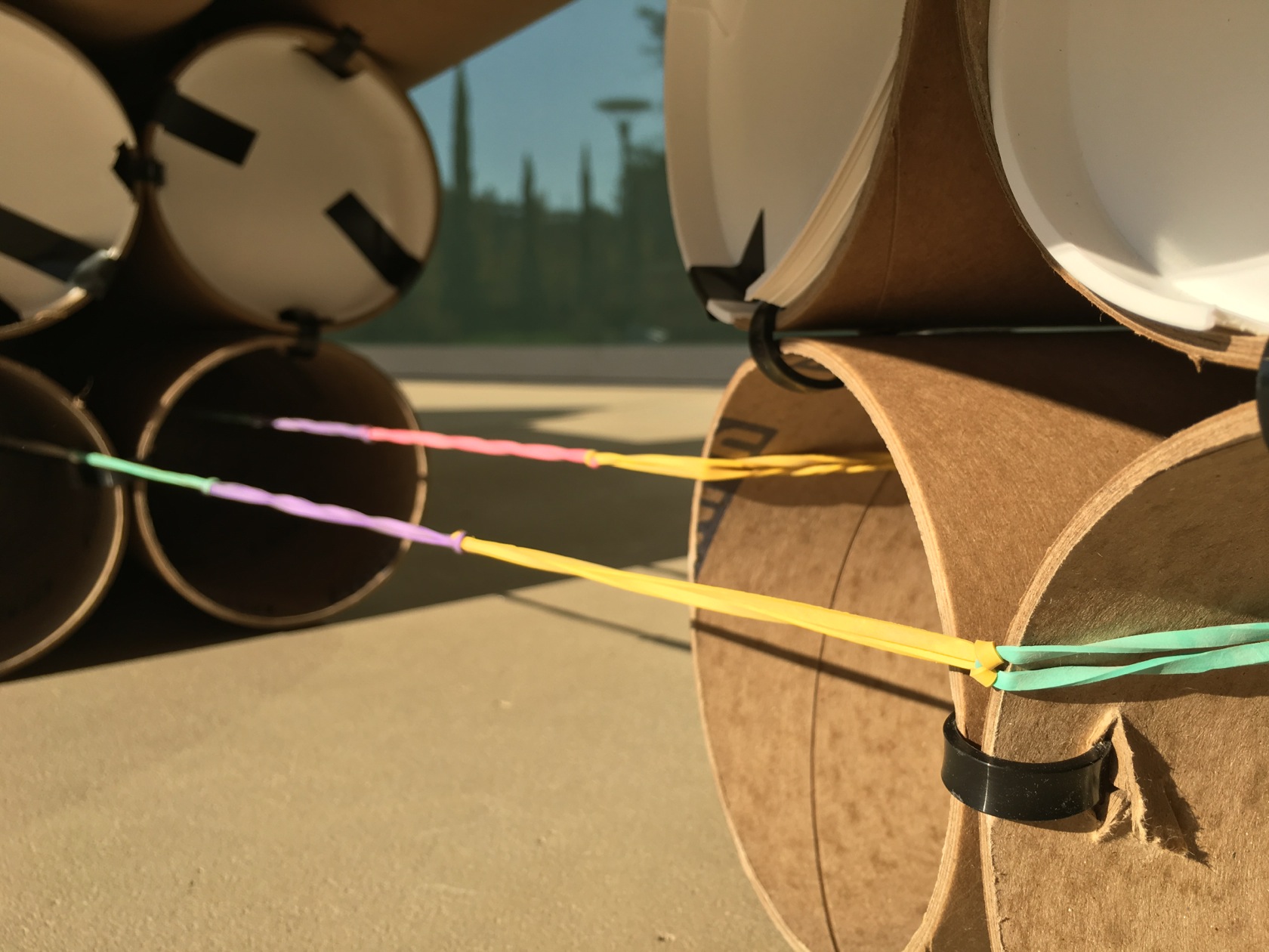 Paper tubes, zip ties, and rubber bands created this interactive piece.
