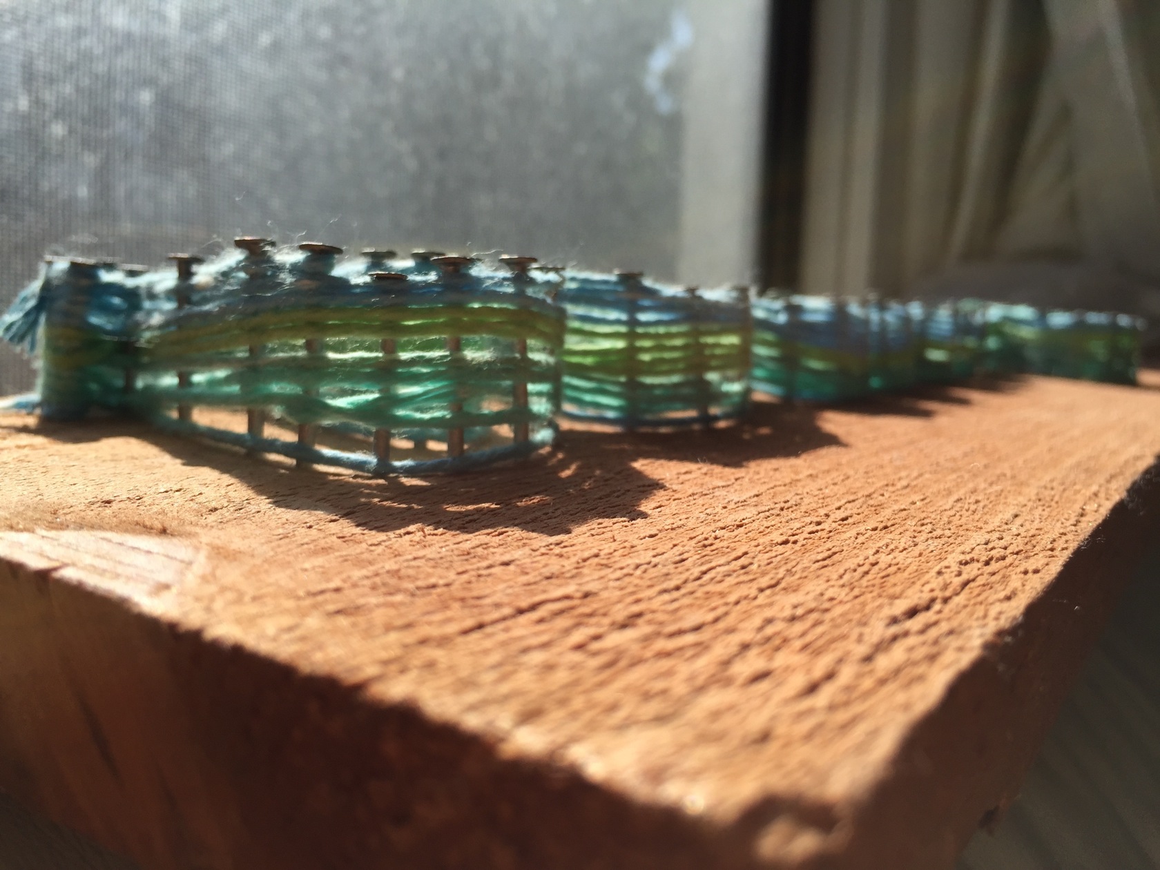 A decoration piece made of redwood plank and turquoise yarn.