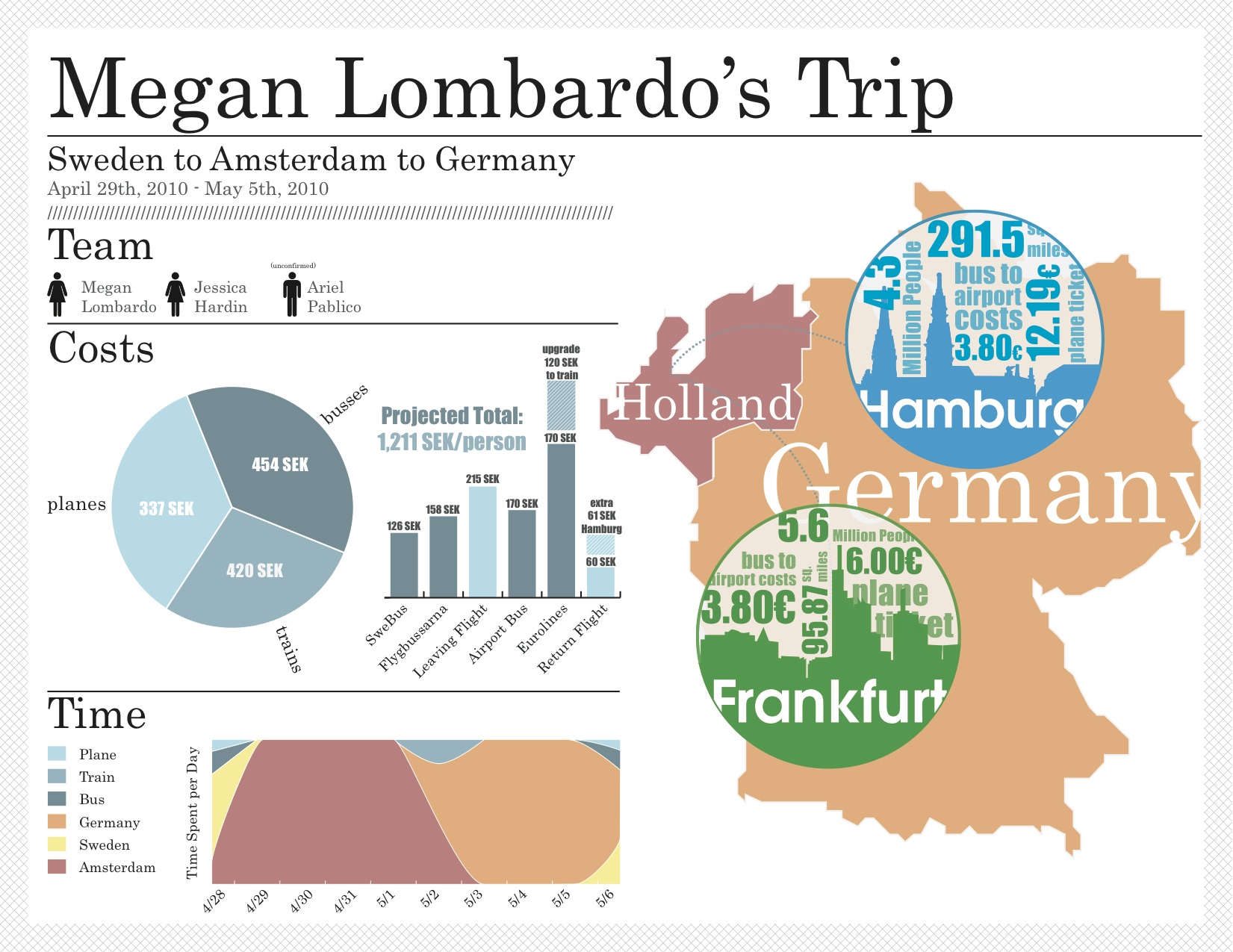 Megan Lombardo’s Trip InfographicAn infographic of an elaborately planned trip.May 15, 2010TYLER BUSHNELL A simple infographic to illustrate some of the interesting facts about a trip organized by a friend.